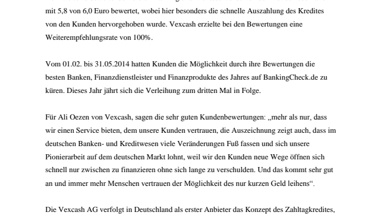 Für Ali Oezen von Vexcash sagen die sehr guten Kundenbewertungen: „mehr als nur, dass wir einen Service bieten, dem unsere Kunden vertrauen, die Auszeichnung zeigt auch, dass im deutschen Banken- und Kreditwesen viele Veränderungen Fuß fassen und sich unsere Pionierarbeit auf dem deutschen Markt lohnt, weil wir den Kunden neue Wege öffnen sich schnell nur zwischen zu finanzieren ohne sich lange zu verschulden. Das kommt sehr gut an und immer mehr Menschen vertrauen der Möglichkeit des nur kurzen Geld-leihens“.