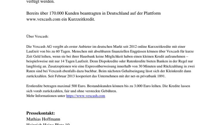 Die Vexcash AG vergibt als erster Anbieter im deutschen Markt seit 2012 online Kurzzeitkredite mit einer Laufzeit von bis zu 60 Tagen. Menschen mit absehbaren finanziellen Engpässen können über Vexcash für kurze Zeit Geld leihen, wenn sie bei ihrer Hausbank keine Möglichkeit haben einen kleinen Kredit aufzunehmen – beispielsweise mit nur 14 Tagen Laufzeit. Denn Dispokredite oder Ratenkredite bieten Banken in der Regel nur langfristig an. Zusatzoptionen wie eine Expressüberweisung innerhalb von 30 Minuten und Rückzahlung in zwei Raten sind bei Vexcash ebenfalls dazu buchbar. Beim nächsten Gehaltseingang lässt sich der Kleinkredit dann zurückzahlen. Seit Februar 2013 kooperiert das Unternehmen mit der net-m privatbank 1891.