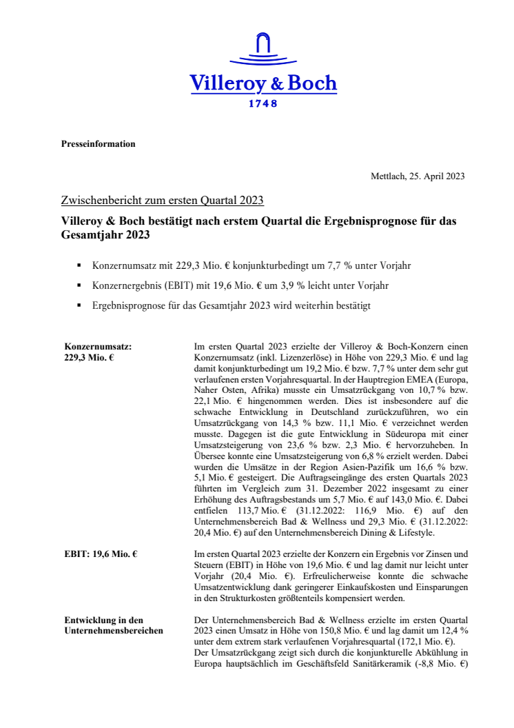 Villeroy & Boch bestätigt nach erstem Quartal die Ergebnisprognose für das Gesamtjahr 2023