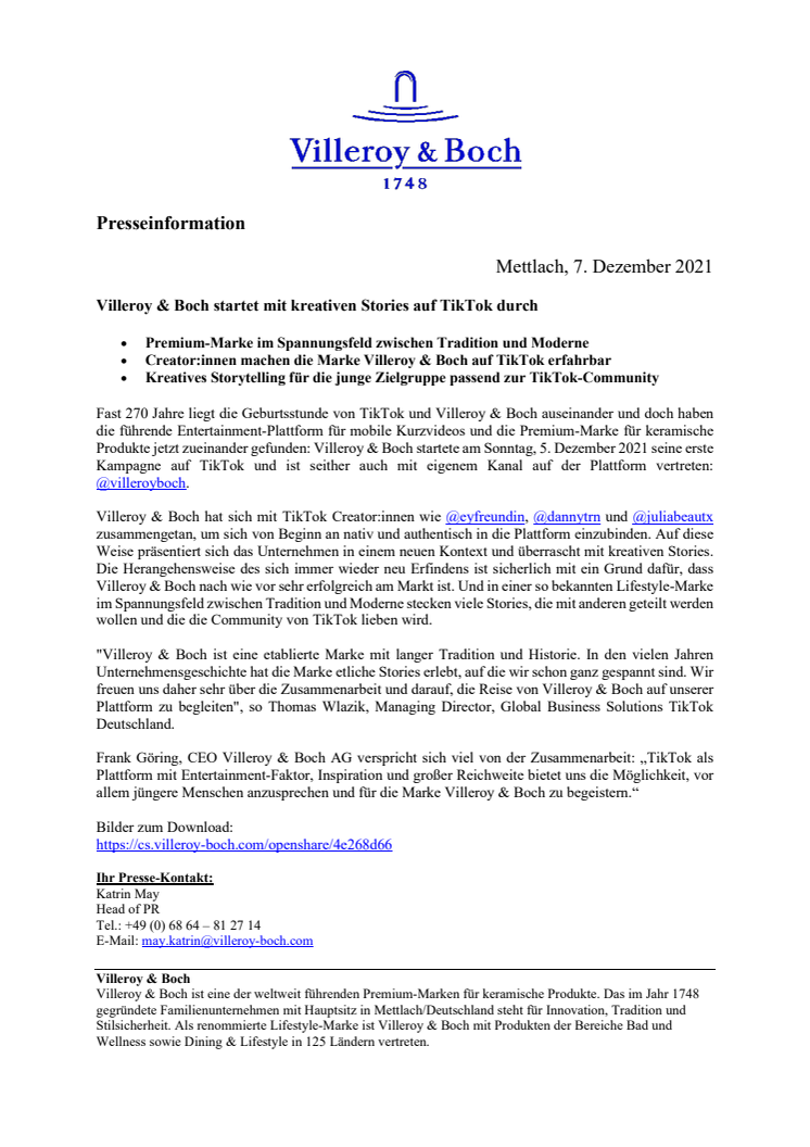 "Villeroy & Boch ist eine etablierte Marke mit langer Tradition und Historie. In den vielen Jahren Unternehmensgeschichte hat die Marke etliche Stories erlebt, auf die wir schon ganz gespannt sind. Wir freuen uns daher sehr über die Zusammenarbeit und darauf, die Reise von Villeroy & Boch auf unserer Plattform zu begleiten", so Thomas Wlazik, Managing Director, Global Business Solutions TikTok Deutschland.
