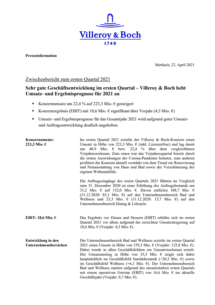 Zwischenbericht zum ersten Quartal 2021: Sehr gute Geschäftsentwicklung im ersten Quartal – Villeroy & Boch hebt Umsatz- und Ergebnisprognose für 2021 an