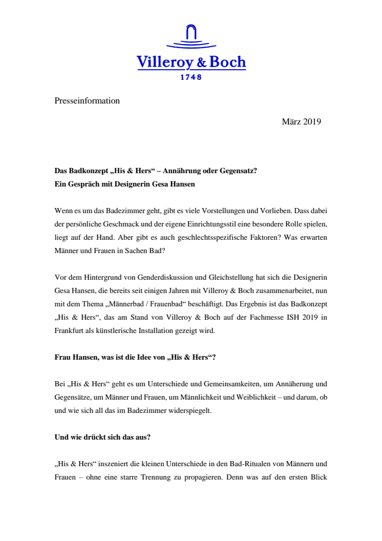 • Das Badkonzept „His & Hers“ – Annährung oder Gegensatz? Ein Gespräch mit Designerin Gesa Hansen