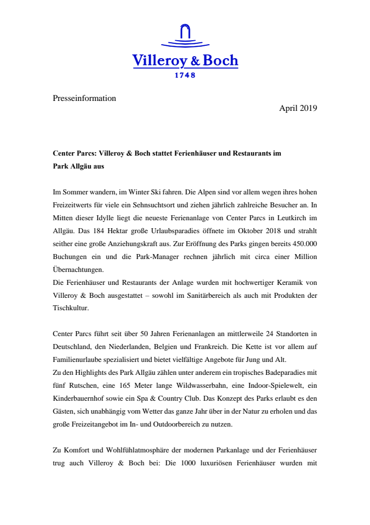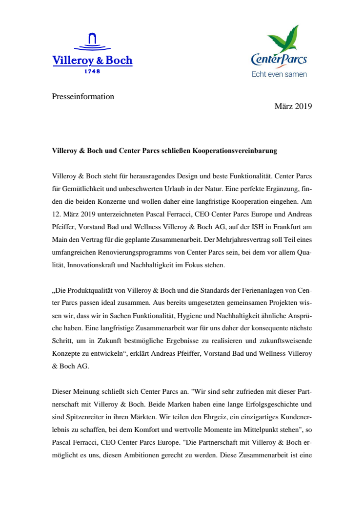 • Villeroy & Boch und Center Parcs schließen Kooperationsvereinbarung