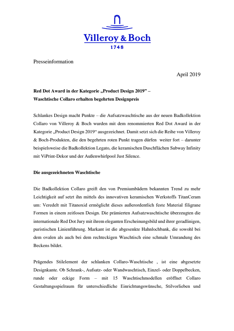 • Red Dot Award in der Kategorie „Product Design 2019” – Waschtische Collaro erhalten begehrten Designpreis