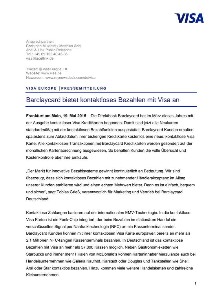 Barclaycard bietet kontaktloses Bezahlen mit Visa an