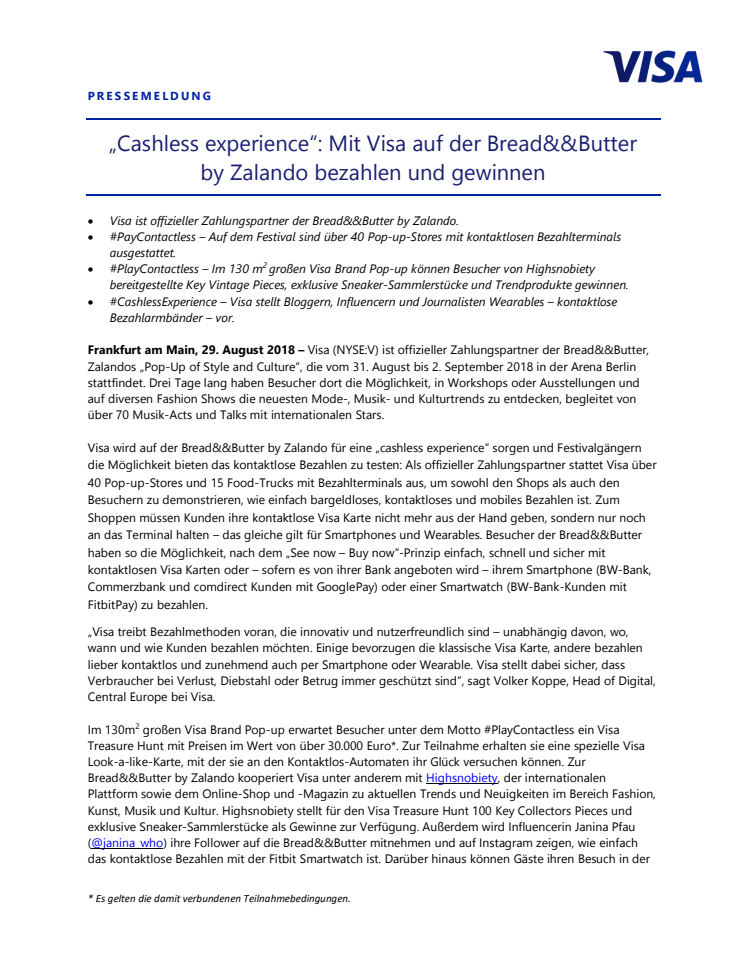 Visa (NYSE:V) ist offizieller Zahlungspartner der Bread&&Butter, Zalandos „Pop-Up of Style and Culture“, die vom 31. August bis 2. September 2018 in der Arena Berlin stattfindet. Drei Tage lang haben Besucher dort die Möglichkeit, in Workshops oder Ausstellungen und auf diversen Fashion Shows die neuesten Mode-, Musik- und Kulturtrends zu entdecken.