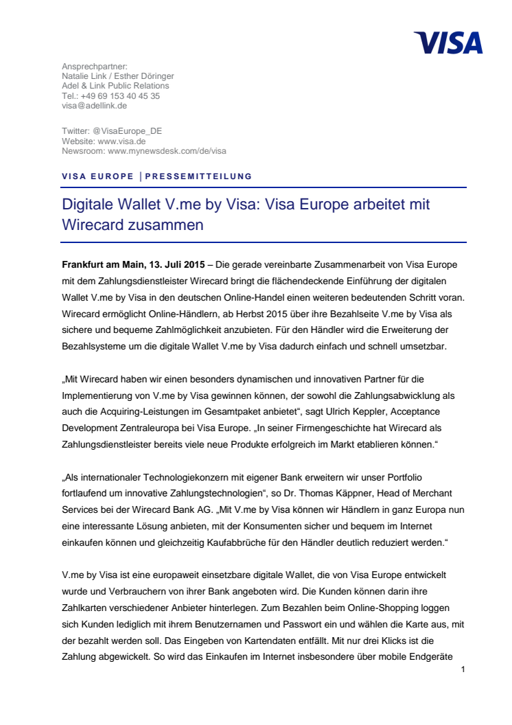 Die gerade vereinbarte Zusammenarbeit von Visa Europe mit dem Zahlungsdienstleister Wirecard bringt die flächendeckende Einführung der digitalen Wallet V.me by Visa in den deutschen Online-Handel einen weiteren bedeutenden Schritt voran. Wirecard ermöglicht Online-Händlern, ab Herbst 2015 über ihre Bezahlseite V.me by Visa als sichere und bequeme Zahlmöglichkeit anzubieten.