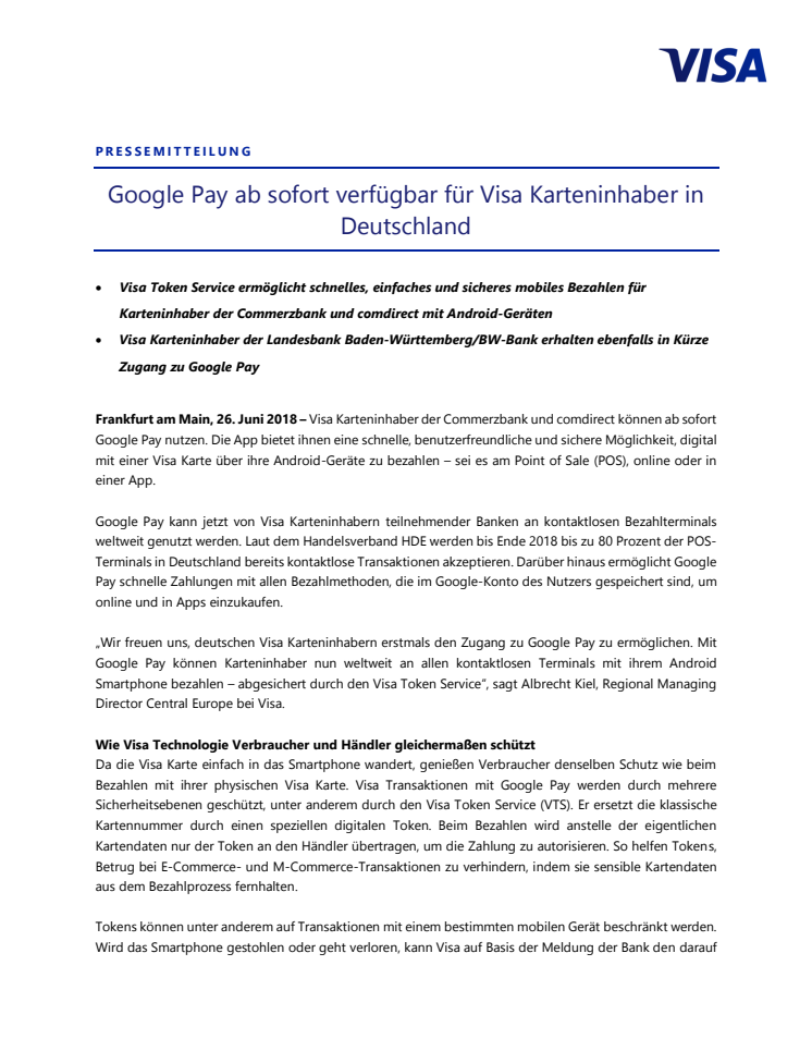 Visa Karteninhaber der Commerzbank und comdirect können ab sofort Google Pay nutzen. Die App bietet ihnen eine schnelle, benutzerfreundliche und sichere Möglichkeit, digital mit einer Visa Karte über ihre Android-Geräte zu bezahlen – sei es am Point of Sale (POS), online oder in einer App.