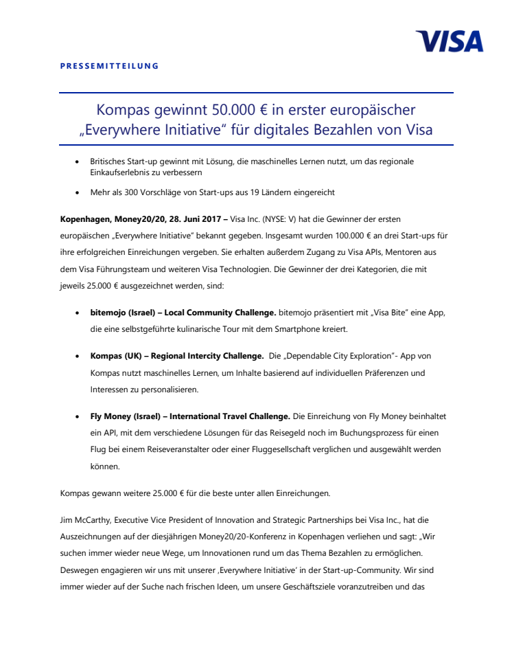 Kompas gewinnt 50.000 € in erster europäischer „Everywhere Initiative“ für digitales Bezahlen von Visa