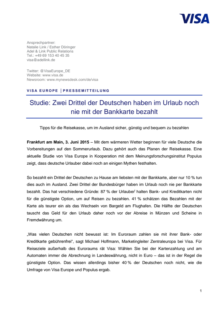 Mit dem wärmeren Wetter beginnen für viele Deutsche die Vorbereitungen auf den Sommerurlaub. Dazu gehört auch das Planen der Reisekasse. Eine aktuelle Studie von Visa Europe in Kooperation mit dem Meinungsforschungsinstitut Populus zeigt, dass deutsche Urlauber dabei noch an einigen Mythen festhalten.