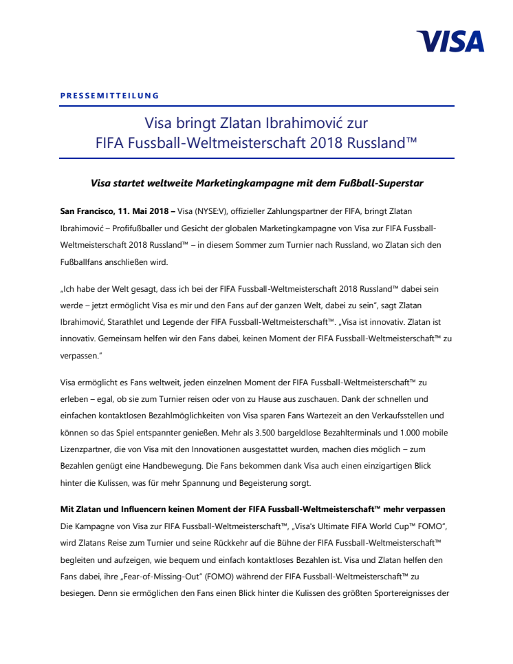 Visa (NYSE:V), offizieller Zahlungspartner der FIFA, bringt Zlatan Ibrahimović – Profifußballer und Gesicht der globalen Marketingkampagne von Visa zur FIFA Fussball-Weltmeisterschaft 2018 Russland™ – in diesem Sommer zum Turnier nach Russland, wo Zlatan sich den Fußballfans anschließen wird.