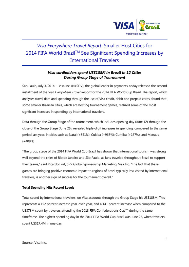 Visa Everywhere Travel Report - Visa cardholders spend US$188M in Brazil in 12 Cities During Group Stage of Tournament