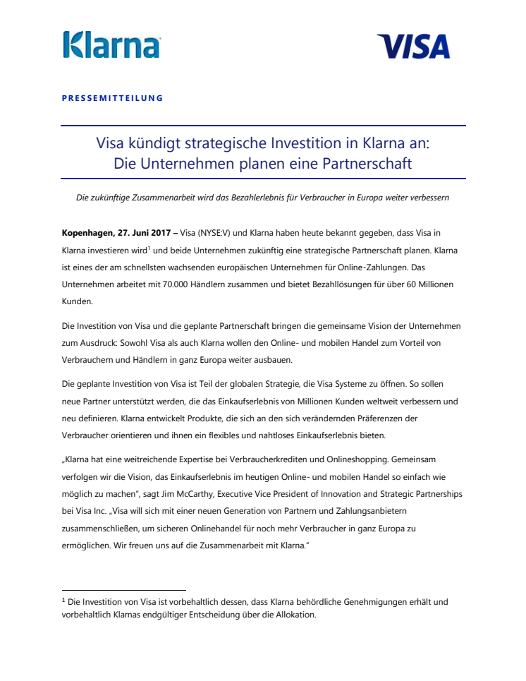 Visa (NYSE:V) und Klarna haben heute bekannt gegeben, dass Visa in Klarna investieren wird[1] und beide Unternehmen zukünftig eine strategische Partnerschaft planen. Klarna ist eines der am schnellsten wachsenden europäischen Unternehmen für Online-Zahlungen. Das Unternehmen arbeitet mit 70.000 Händlern zusammen und bietet Bezahllösungen für über 60 Millionen Kunden.