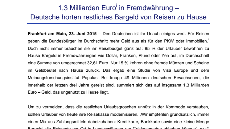 Frankfurt am Main, 23. Juni 2015 – Den Deutschen ist ihr Urlaub einiges wert. Für Reisen geben die Bundesbürger im Durchschnitt mehr Geld aus als für den PKW oder Immobilien.** Doch nicht immer brauchen sie ihr Reisebudget ganz auf: 85 % der Urlauber bewahren zu Hause Bargeld in Fremdwährungen wie Dollar, Franken, Pfund oder Yen auf, im Durchschnitt eine Summe von umgerechnet 32,61 Euro. Nur 15 % kehren ohne fremde Münzen und Scheine im Geldbeutel nach Hause zurück. Das ergab eine Studie von Visa Europe und dem Meinungsforschungsinstitut Populus. Bei knapp 49 Millionen deutschen Erwachsenen, die innerhalb der letzten drei Jahre gereist sind, summiert sich das auf insgesamt 1,3 Milliarden Euro – Geld, das ungenutzt zu Hause liegt.