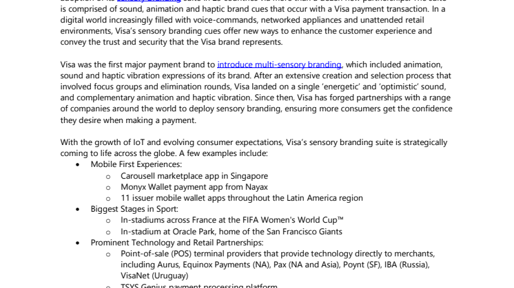 Cannes, France and San Francisco, CA – June 17, 2019 – Visa (NYSE: V) today announced global adoption of its sensory branding suite in 25 countries via more than a dozen new partnerships. The suite is comprised of sound, animation and haptic brand cues that occur with a Visa payment transaction. In a digital world increasingly filled with voice-commands, networked appliances and unattended retail environments, Visa’s sensory branding cues offer new ways to enhance the customer experience and convey the trust and security that the Visa brand represents.