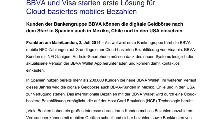 Frankfurt am Main/London, 2. Juli 2014 – Als weltweit erste Bankengruppe führt die BBVA mobile NFC-Zahlungen auf Grundlage einer Cloud-basierten Bezahllösung von Visa ein. BBVA-Kunden mit NFC-fähigem Android-Smartphone müssen dank des neuen Systems lediglich die aktualisierte Version der BBVA Wallet App herunterladen und können damit kontaktlos einkaufen.