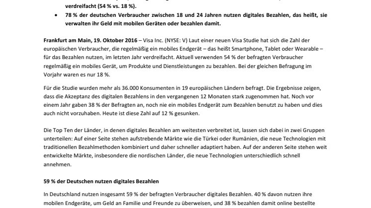 Frankfurt am Main, 19. Oktober 2016 – Visa Inc. (NYSE: V) Laut einer neuen Visa Studie hat sich die Zahl der europäischen Verbraucher, die regelmäßig ein mobiles Endgerät – das heißt Smartphone, Tablet oder Wearable – für das Bezahlen nutzen, im letzten Jahr verdreifacht. Aktuell verwenden 54 % der befragten Verbraucher regelmäßig ein mobiles Gerät, um Produkte und Dienstleistungen zu bezahlen. Bei der gleichen Befragung im Vorjahr waren es nur 18 %.