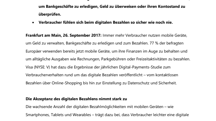 Frankfurt am Main, 26. September 2017:Immer mehr Verbraucher nutzen mobile Geräte, um Geld zu verwalten, Bankgeschäfte zu erledigen und zum Bezahlen. 77 % der befragten Europäer verwenden bereits jetzt mobile Geräte, um ihre Finanzen im Auge zu behalten und um alltägliche Ausgaben wie Rechnungen, Parkgebühren oder Freizeitaktivitäten zu bezahlen. Visa (NYSE: V) hat dazu die Ergebnisse der jährlichen Digital-Payments-Studie zum Verbraucherverhalten rund um das digitale Bezahlen veröffentlicht – vom kontaktlosen Bezahlen über Online-Shopping bis hin zur Einstellung zu Datenschutz und Sicherheit.