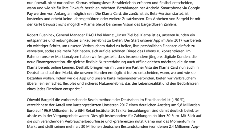 Robert Bueninck, General Manager DACH bei Klarna: „Unser Ziel bei Klarna ist es, unseren Kunden ein entspanntes und reibungsloses Einkaufserlebnis zu bieten. Der Start unserer App im Jahr 2017 war bereits ein wichtiger Schritt, um unseren Verbrauchern dabei zu helfen, ihre persönlichen Finanzen einfach zu verwalten, sodass sie mehr Zeit haben, sich auf die schönen Dinge des Lebens zu konzentrieren. Im Rahmen unserer Marktanalysen haben wir festgestellt, dass insbesondere jüngere, digitale Kunden, die neue Finanzgeneration, die gleiche flexible Nutzererfahrung auch offline erleben möchten, die sie von Klarna bereits online kennen. Deshalb bringen wir mit unserem Partner Visa die Klarna Card nun auch in Deutschland auf den Markt, die unseren Kunden ermöglicht frei zu entscheiden, wann, wo und wie sie bezahlen wollen. Indem wir die App und unsere Karte miteinander verbinden, bieten wir Verbrauchern überall ein einfaches, flexibles und sicheres Nutzererlebnis, das der Lebensrealität und den Bedürfnissen eines jedes Einzelnen entspricht.“