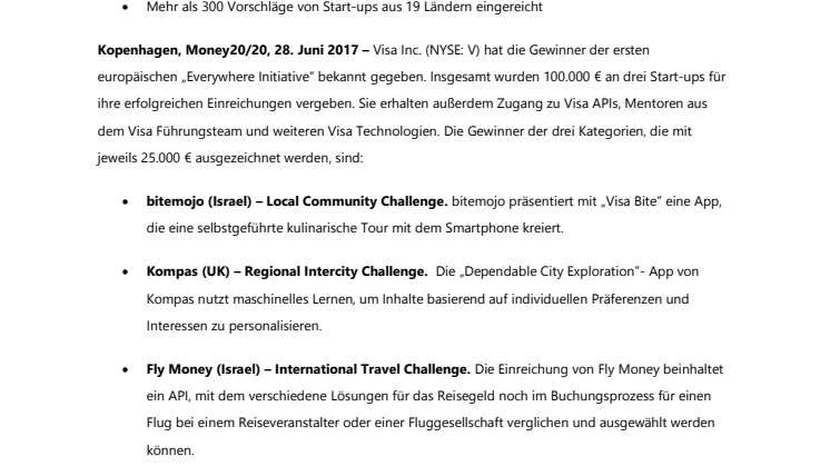 Kopenhagen, Money20/20, 28. Juni 2017 – Visa Inc. (NYSE: V) hat die Gewinner der ersten europäischen „Everywhere Initiative“ bekannt gegeben. Insgesamt wurden 100.000 € an drei Start-ups für ihre erfolgreichen Einreichungen vergeben. Sie erhalten außerdem Zugang zu Visa APIs, Mentoren aus dem Visa Führungsteam und weiteren Visa Technologien. Die Gewinner der drei Kategorien, die mit jeweils 25.000 € ausgezeichnet werden, sind: