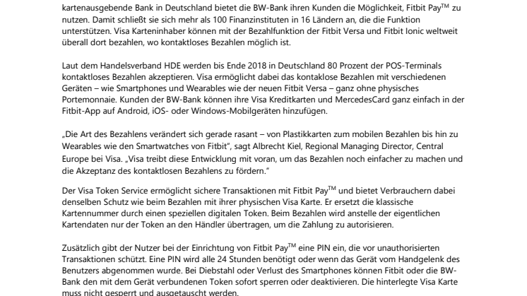 Laut dem Handelsverband HDE werden bis Ende 2018 in Deutschland 80 Prozent der POS-Terminals kontaktloses Bezahlen akzeptieren. Visa ermöglicht dabei das kontaklose Bezahlen mit verschiedenen Geräten – wie Smartphones und Wearables wie der neuen Fitbit Versa – ganz ohne physisches Portemonnaie. Kunden der BW-Bank können ihre Visa Kreditkarten und MercedesCard ganz einfach in der Fitbit-App auf Android, iOS- oder Windows-Mobilgeräten hinzufügen.