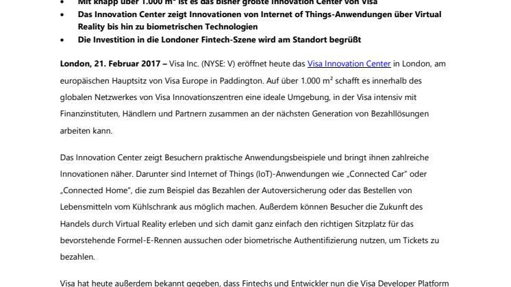 London, 21. Februar 2017 – Visa Inc. (NYSE: V) eröffnet heute das Visa Innovation Center in London, am europäischen Hauptsitz von Visa Europe in Paddington. Auf über 1.000 m² schafft es innerhalb des globalen Netzwerkes von Visa Innovationszentreneine ideale Umgebung, in der Visa intensiv mit Finanzinstituten, Händlern und Partnern zusammen an der nächsten Generation von Bezahllösungen arbeiten kann.