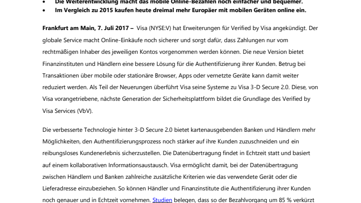 Frankfurt am Main, 7. Juli 2017 –Visa (NYSE:V) hat Erweiterungen für Verified by Visa angekündigt. Der globale Service macht Online-Einkäufe noch sicherer und sorgt dafür, dass Zahlungen nur vom rechtmäßigen Inhaber des jeweiligen Kontos vorgenommen werden können. Die neue Version bietet Finanzinstituten und Händlern eine bessere Lösung für die Authentifizierung ihrer Kunden. Betrug bei Transaktionen über mobile oder stationäre Browser, Apps oder vernetzte Geräte kann damit weiter reduziert werden. Als Teil der Neuerungen überführt Visa seine Systeme zu Visa 3-D Secure 2.0. Diese, von Visa vorangetriebene, nächste Generation der Sicherheitsplattform bildet die Grundlage des Verified by Visa Services (VbV).