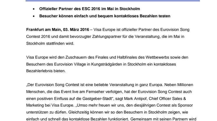 Frankfurt am Main, 03. März 2016 –Visa Europe ist offizieller Partner des Eurovision Song Contest 2016 und damit bevorzugter Zahlungspartner für die Veranstaltung, die im Mai in Stockholm stattfinden wird.
