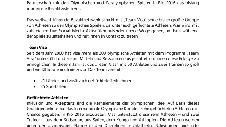 Das weltweit führende Bezahlnetzwerk schickt mit „Team Visa” seine bisher größte Gruppe von Athleten zu den Olympischen Spielen, darunter auch geflüchtete Athleten. Visa wird mit zahlreichen Live-Social-Media-Aktivitäten außerdem neue Wege gehen, um Fans während der Spiele zu unterhalten und mit ihnen in Kontakt zu treten.