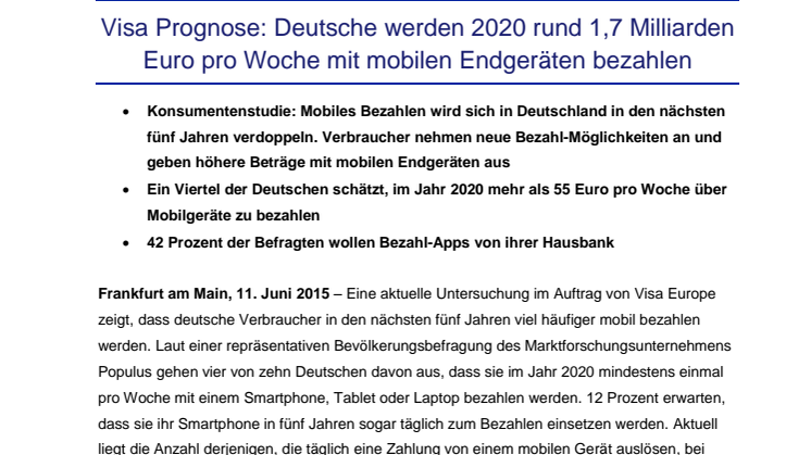Frankfurt am Main, 11. Juni 2015 – Eine aktuelle Untersuchung im Auftrag von Visa Europe zeigt, dass deutsche Verbraucher in den nächsten fünf Jahren viel häufiger mobil bezahlen werden. Laut einer repräsentativen Bevölkerungsbefragung des Marktforschungsunternehmens Populus gehen vier von zehn Deutschen davon aus, dass sie im Jahr 2020 mindestens einmal pro Woche mit einem Smartphone, Tablet oder Laptop bezahlen werden. 12 Prozent erwarten, dass sie ihr Smartphone in fünf Jahren sogar täglich zum Bezahlen einsetzen werden. Aktuell liegt die Anzahl derjenigen, die täglich eine Zahlung von einem mobilen Gerät auslösen, bei 6 Prozent.