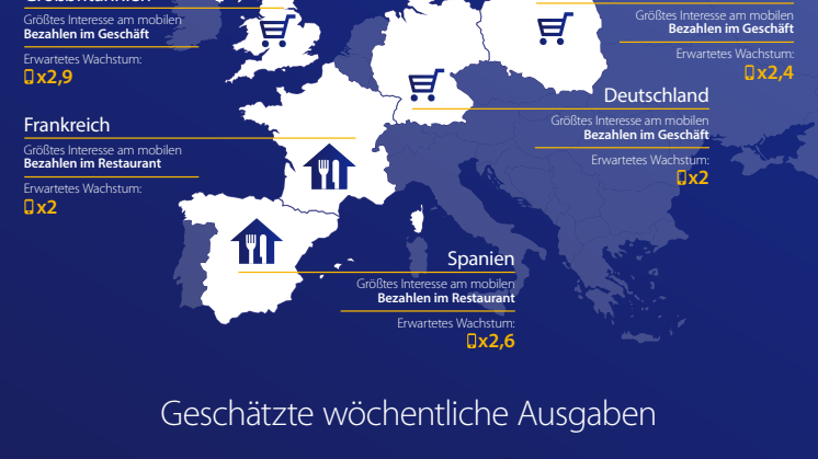 Das Wachstum wird mit einer erheblichen Steigerung der wöchentlichen Ausgaben einhergehen, die über mobile Endgeräte getätigt werden. Der durchschnittliche deutsche Konsument erwartet, dass er in fünf Jahren einen wöchentlichen Betrag von 33 Euro mobil bezahlen wird – das sind 65 Prozent mehr als heute. Mehr als 25 Prozent der Deutschen gehen sogar davon aus, bis dahin über 55 Euro pro Woche mit einem mobilen Endgerät auszugeben. Das Gesamtvolumen des mobilen Bezahlmarktes in Deutschland wird auf Basis der Studienergebnisse im Jahr 2020 auf über 1,7 Milliarden Euro pro Woche geschätzt. 1