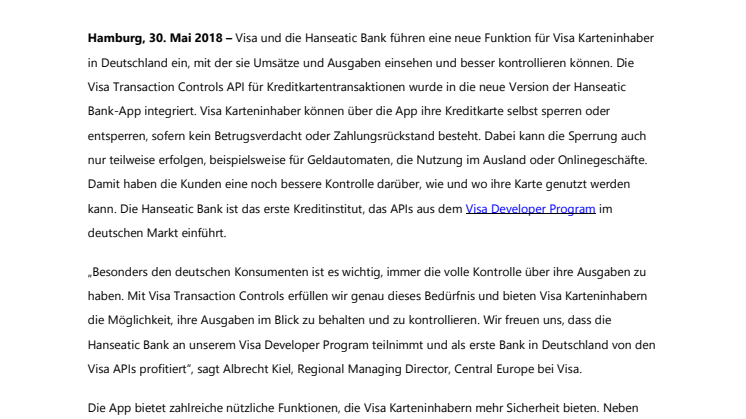 Hamburg, 30. Mai 2018 – Visa und die Hanseatic Bank führen eine neue Funktion für Visa Karteninhaber in Deutschland ein, mit der sie Umsätze und Ausgaben einsehen und besser kontrollieren können. Die Visa Transaction Controls API für Kreditkartentransaktionen wurde in die neue Version der Hanseatic Bank-App integriert. Visa Karteninhaber können über die App ihre Kreditkarte selbst sperren oder entsperren, sofern kein Betrugsverdacht oder Zahlungsrückstand besteht. Dabei kann die Sperrung auch nur teilweise erfolgen, beispielsweise für Geldautomaten, die Nutzung im Ausland oder Onlinegeschäfte. Damit haben die Kunden eine noch bessere Kontrolle darüber, wie und wo ihre Karte genutzt werden kann. Die Hanseatic Bank ist das erste Kreditinstitut, das APIs aus dem Visa Developer Program im deutschen Markt einführt.