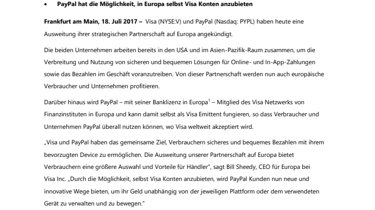 Frankfurt am Main, 18. Juli 2017 – Visa (NYSE:V) und PayPal (Nasdaq: PYPL) haben heute eine Ausweitung ihrer strategischen Partnerschaft auf Europa angekündigt.