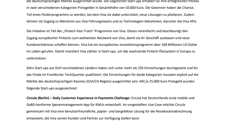 Die Initiative ist Teil des „Fintech-Fast-Track“-Programms von Visa. Dieses vereinfacht und beschleunigt den Zugang europäischer Fintechs zum weltweiten Netzwerk von Visa, damit sie ihr Geschäft ausbauen und neue Kundenerlebnisse schaffen können. Visa hat ein europäisches Investitionsprogramm über 100 Millionen US-Dollar ins Leben gerufen. Damit investiert Visa stärker in Start-ups, um das wachsende Fintech-Ökosystem in Europa zu unterstützen.