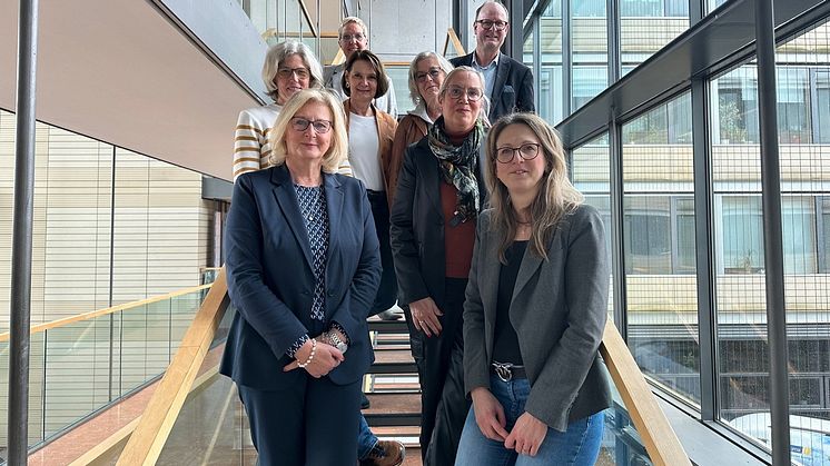 Bild 1: Vertreter der Kommunen und Tourismusverbände bei der Präsentation der Ergebnisse im Kreishaus Hameln-Pyrmont (Copyright: Weserbergland Tourismus e.V.), Links von unten nach oben und rechts von oben nach unten: Petra Wegener (Geschäftsführerin des Weserbergland Tourismus e.V.), Christine Bossow (Mitarbeiterin der Wirtschaftsförderung Landkreis Holzminden), Dr. Maren Fröhlich (Stadtbaurätin Stadt Nienburg), Martina Harms (Erste Stadträtin Stadt Hameln), Martin Fahrland (Geschäftsführer Mittelweser-Touristik GmbH), Bettina Remmert (Amtsleiterin der Wirtschaftsförderung Landkreis Hameln-Pyrmont), Julia Gogrewe (Baudezernentin Landkreis Northeim), Sina Scholz (Senior Projektmanagerin beim Weserbergland Tourismus e.V.)