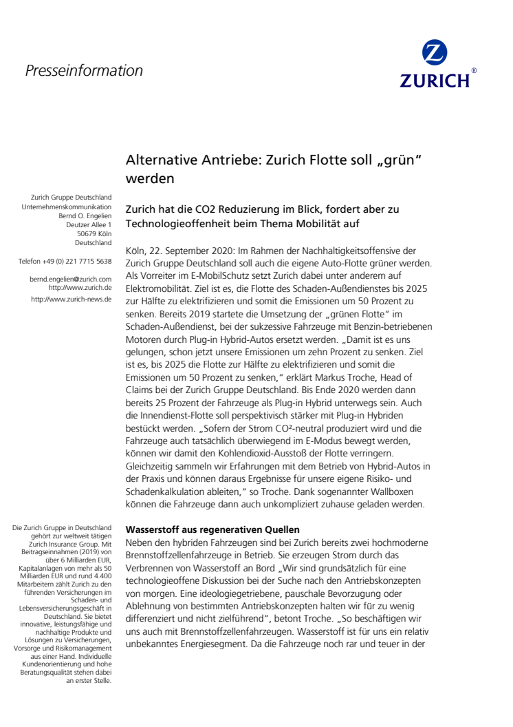 Zurich hat die CO2 Reduzierung im Blick, fordert aber zu Technologieoffenheit beim Thema Mobilität auf.