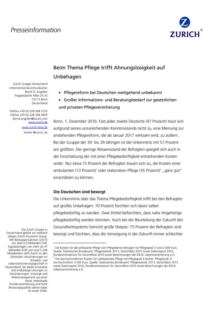 Bonn, 1. Dezember 2016 Fast jeder zweite Deutsche (47 Prozent) traut sich aufgrund seines unzureichenden Kenntnisstands nicht zu, eine Meinung zur anstehenden Pflegereform, die ab Januar 2017 wirksam wird, zu äußern.