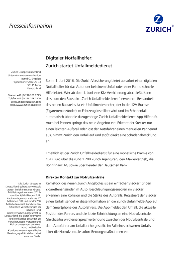 Die Zurich Versicherung bietet ab sofort einen digitalen Notfallhelfer für das Auto, der bei einem Unfall oder einer Panne schnelle Hilfe leistet. Wer ab dem 1. Juni eine Kfz-Versicherung abschließt, kann diese um den Baustein „Zurich Unfallmeldedienst“ erweitern.