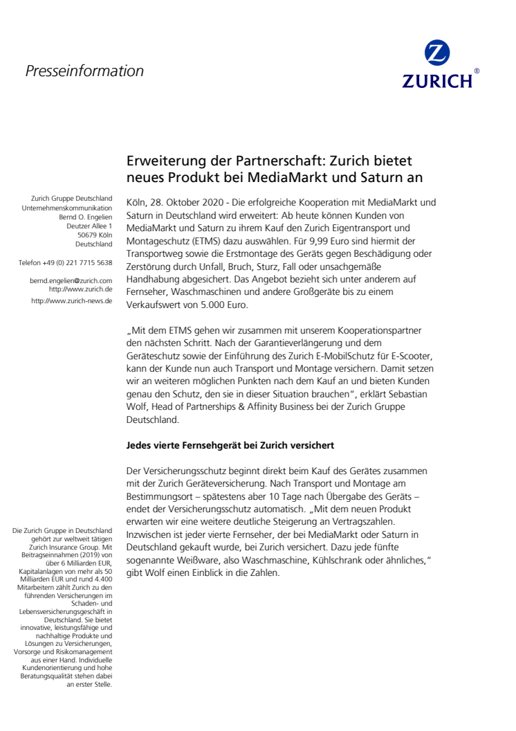 Die erfolgreiche Kooperation mit MediaMarkt und Saturn in Deutschland wird erweitert: Kunden von MediaMarkt und Saturn können nun zu ihrem Kauf den Zurich Eigentransport und Montageschutz (ETMS) auswählen. Für 9,99 Euro sind der Transportweg sowie die Erstmontage des Geräts gegen Beschädigung oder Zerstörung durch Unfall, Bruch, Sturz, Fall oder unsachgemäße Handhabung abgesichert.