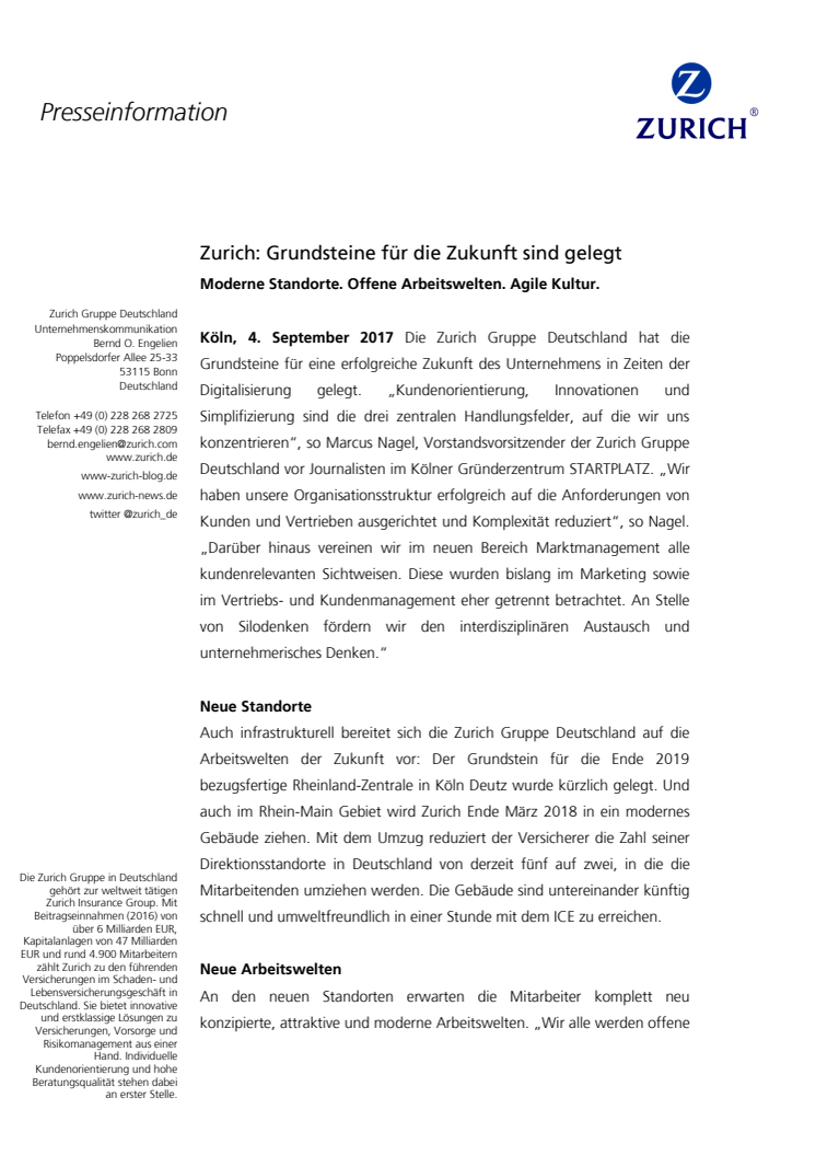 Die Zurich Gruppe Deutschland hat die Grundsteine für eine erfolgreiche Zukunft des Unternehmens in Zeiten der Digitalisierung gelegt. „Kundenorientierung, Innovationen und Simplifizierung sind die drei zentralen Handlungsfelder, auf die wir uns konzentrieren“, so Marcus Nagel, Vorstandsvorsitzender der Zurich Gruppe Deutschland.
