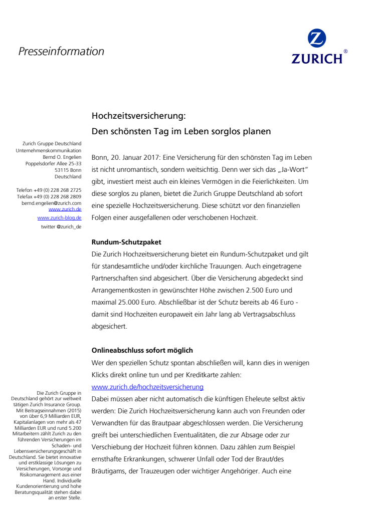Eine Versicherung für den schönsten Tag im Leben ist nicht unromantisch, sondern weitsichtig. Denn wer sich das „Ja-Wort“ gibt, investiert meist auch ein kleines Vermögen in die Feierlichkeiten. Um diese sorglos zu planen, bietet die Zurich Gruppe Deutschland ab sofort eine spezielle Hochzeitsversicherung. Diese schützt vor den finanziellen
