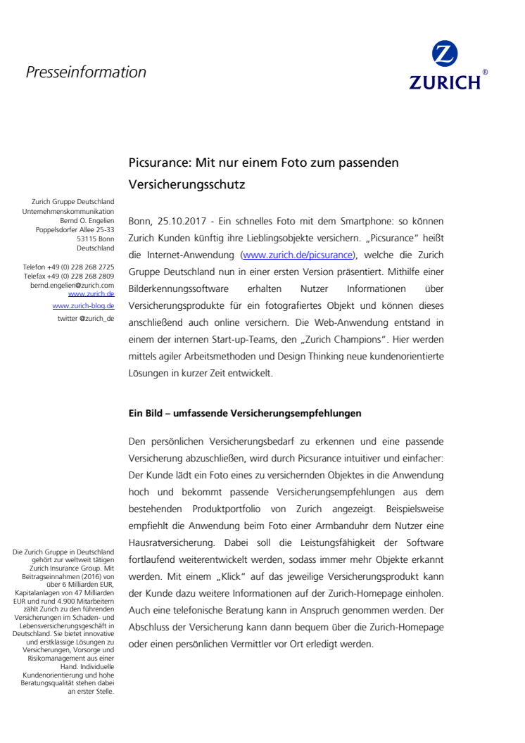 „Picsurance“ heißt die Internet-Anwendung, welche die Zurich Gruppe Deutschland nun in einer ersten Version präsentiert. Mithilfe einer Bilderkennungssoftware erhalten Nutzer Informationen über Versicherungsprodukte für ein fotografiertes Objekt und können dieses anschließend auch online versichern.