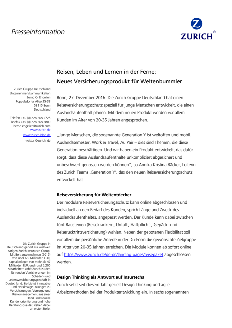 Bonn, 27. Dezember 2016 Die Zurich Gruppe Deutschland hat einen Reiseversicherungsschutz speziell für junge Menschen entwickelt, die einen Auslandsaufenthalt planen. Mit dem neuen Produkt werden vor allem Kunden im Alter von 20-35 Jahren angesprochen.