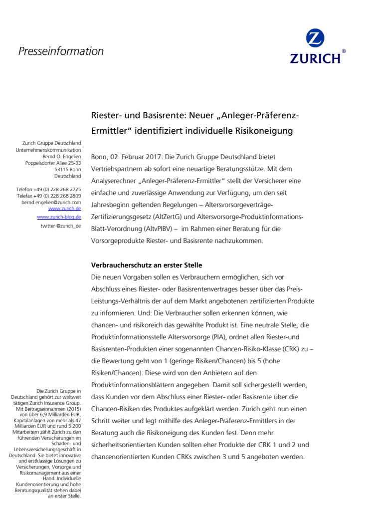 Die Zurich Gruppe Deutschland bietet Vertriebspartnern ab sofort eine neuartige Beratungsstütze. Mit dem Analyserechner „Anleger-Präferenz-Ermittler“ stellt der Versicherer eine einfache und zuverlässige Anwendung zur Verfügung, um den seit Jahresbeginn geltenden Regelungen im Rahmen einer Beratung für die Vorsorgeprodukte Riester- und Basisrente nachzukommen.