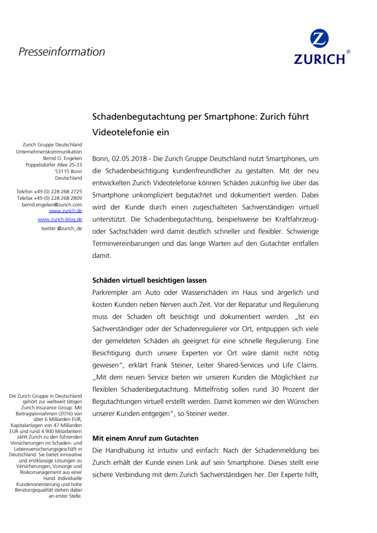 Mit der neu entwickelten Zurich Videotelefonie können Schäden zukünftig live über das Smartphone unkompliziert begutachtet und dokumentiert werden. Dabei wird der Kunde durch einen zugeschalteten Sachverständigen virtuell unterstützt. Schwierige Terminvereinbarungen und das lange Warten auf den Gutachter entfallen damit.