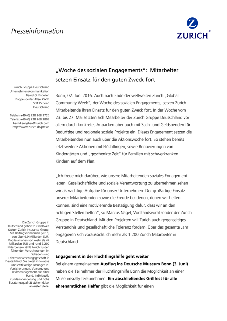 Auch nach Ende der weltweiten Zurich „Global Community Week“, der Woche des sozialen Engagements, setzen Zurich Mitarbeitende ihren Einsatz für den guten Zweck fort.