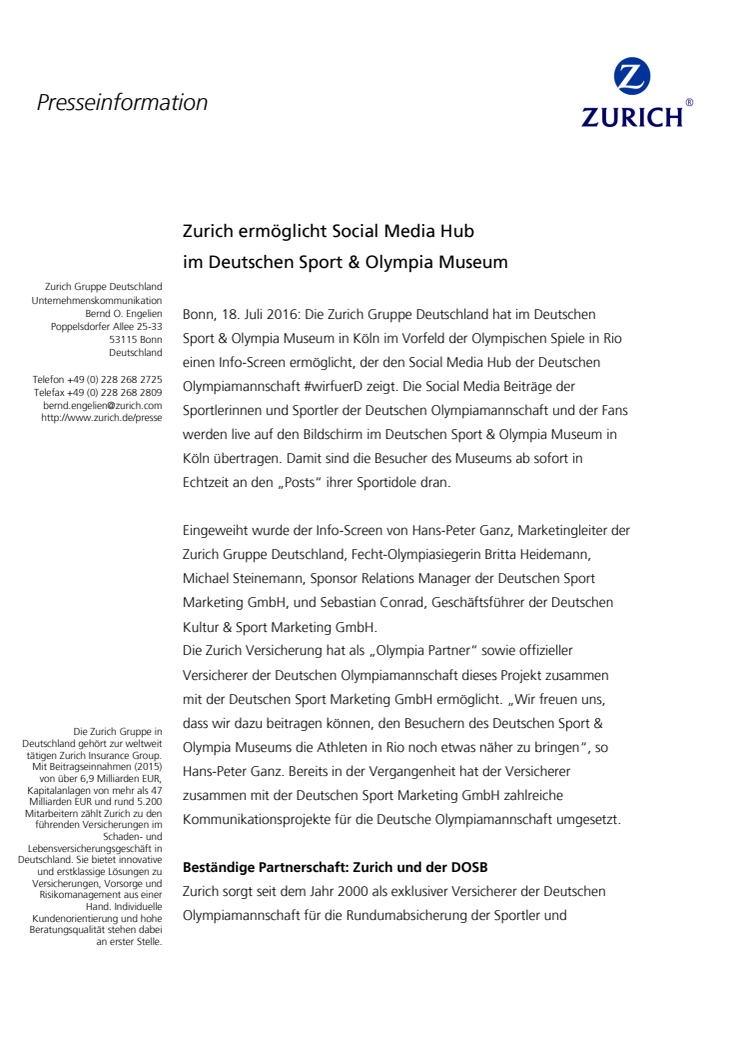 Die Zurich Gruppe Deutschland hat im Deutschen Sport & Olympia Museum in Köln im Vorfeld der Olympischen Spiele in Rio einen Info-Screen ermöglicht, der den Social Media Hub der Deutschen Olympiamannschaft #wirfuerD zeigt.