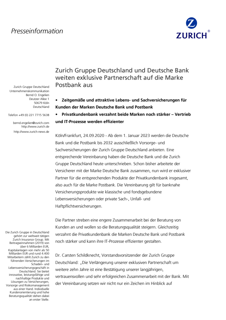Zurich Gruppe Deutschland und Deutsche Bank weiten exklusive Partnerschaft auf die Marke Postbank aus