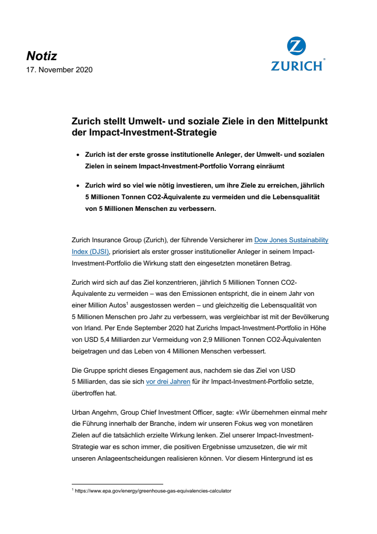 Zurich ist der erste große institutionelle Anleger, der Umwelt- und sozialen Zielen in seinem Impact-Investment-Portfolio Vorrang einräumt. Der Versicherer wird so viel wie nötig investieren, um seine Ziele zu erreichen, jährlich 5 Millionen Tonnen CO2-Äquivalente zu vermeiden und die Lebensqualität von 5 Millionen Menschen zu verbessern.