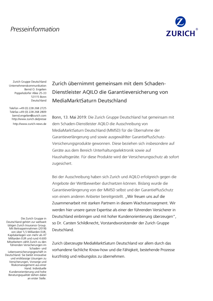 Die Zurich Gruppe Deutschland hat gemeinsam mit dem Schaden-Dienstleister AQILO die Ausschreibung von MediaMarktSaturn Deutschland (MMSD) für die Übernahme der Garantieverlängerung und sowie ausgewählter GarantiePlusSchutz-Versicherungsprodukte gewonnen. Diese beziehen sich insbesondere auf Geräte aus dem Bereich Unterhaltungselektronik sowie auf Haushaltsgeräte.